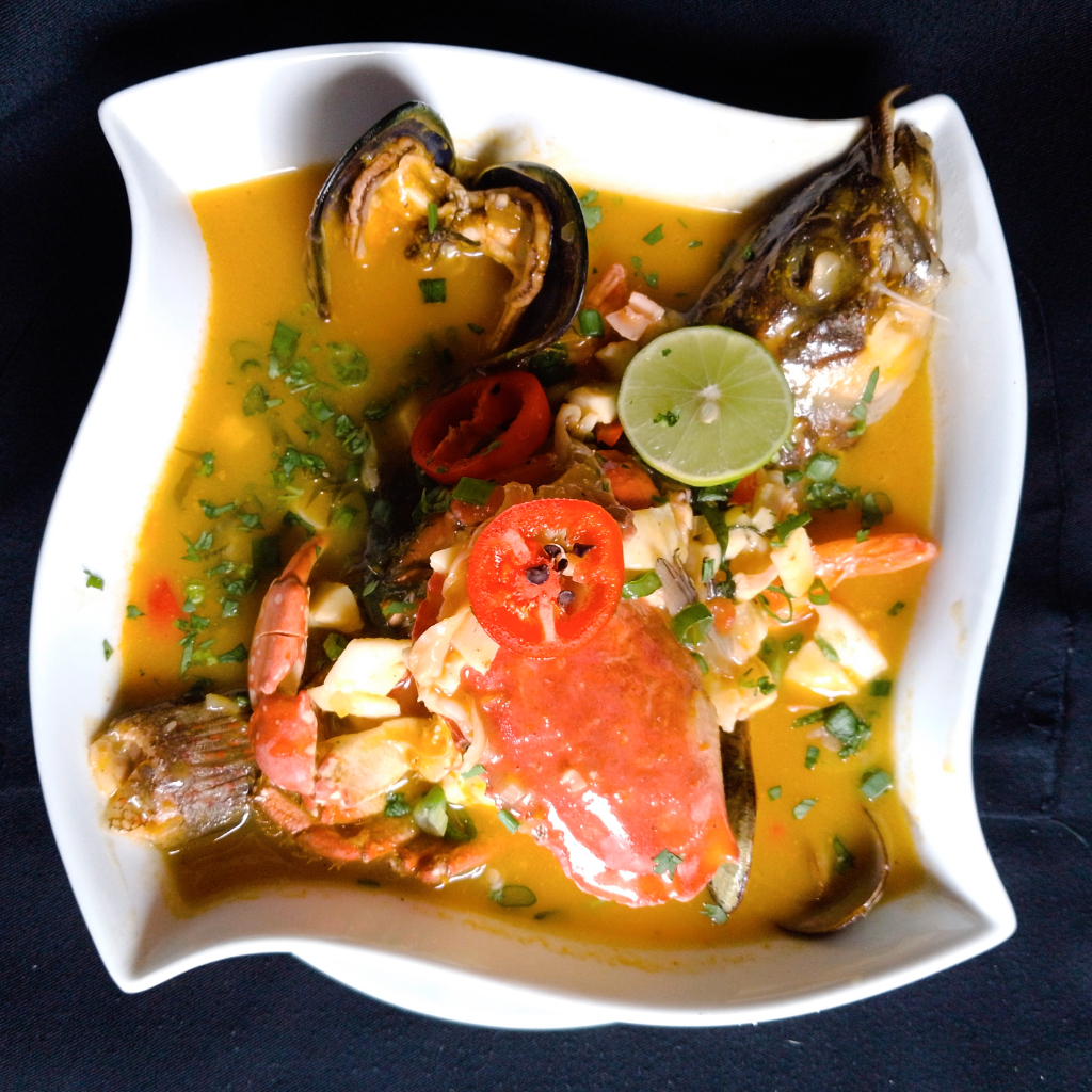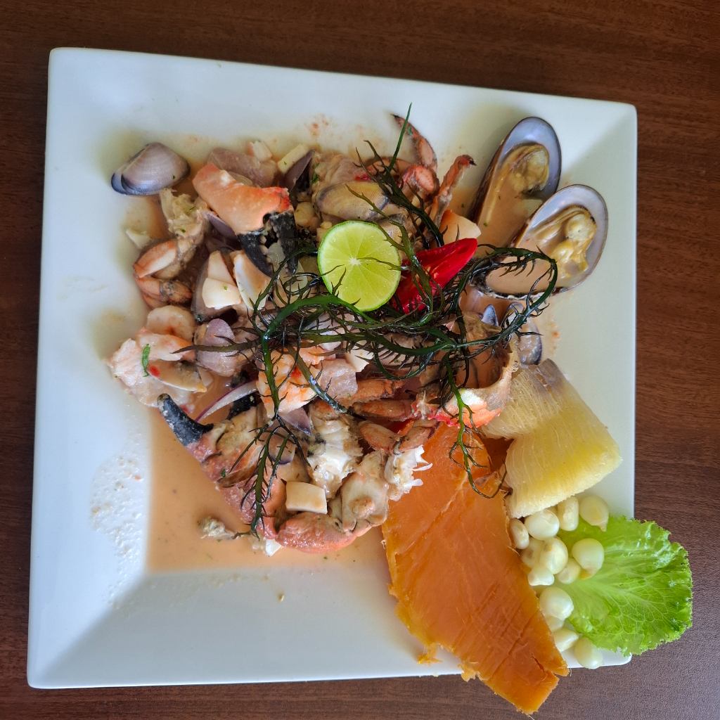 Ceviche, pescado frito y chicharrón de potade más crema
